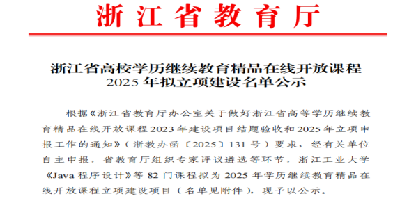 根据《浙江省教育厅办公室关于做好浙江省高等学历继续教育精品在线开放课程2023年建设项目结题验收和2025年立项申报工作的通知》(浙教办函〔2025131 号)要求,经教师自主申报,省教育厅组织专家评议遴选等环节,我校生态健康学院陈郁老师报送的《药物分析检测技术》与特种设备学院洪尉尉老师的《机械设计 CAD》(二维软件)获浙江省高校学历继续教育精品在线开放课程2025年拟立项建设。