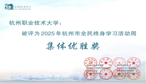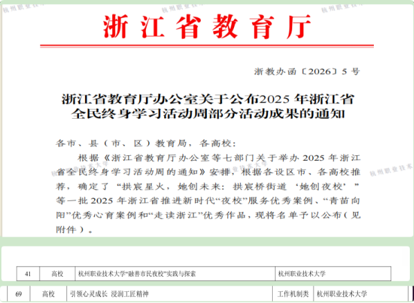 115日,《浙江省教育厅办公室关于公布2025年浙江省全民终身学习活动周部分活动成果的通知》(浙教办函〔2026〕5号),我校报送的两项案例全部获得浙江省全民终身教育活动周活动成果,向全省公共服务平台进行集中宣传展示,同时获得全省全民终身教育集体优胜奖。