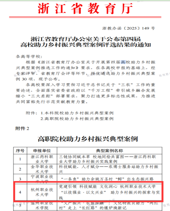 我校《党建引领 科技赋能 文化润心——杭州职业技术大学“以技强业・以文兴业”助力乡村振兴的探索与实践》入选浙江省第四届高校助力乡村振兴典型案例,作为市属高校唯一一个入选的案例,体现了学校全面贯彻国家战略,以及落实省委省政府“千万工程”牵引城乡融合发展缩小“三大差距”的部署要求。整合我校理工类办学优势特色,发挥科技人员的专业技能,助力乡村振兴缩小城乡差距为推进共同富裕先行示范贡献职教力量。