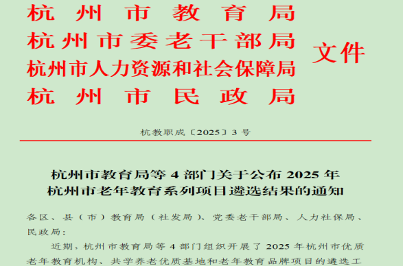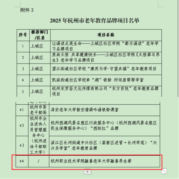 近期,杭州市教育局、杭州市委老干部局等4部门联合发文,公布2025年杭州市老年教育系列项目遴选结果,我校融老年大学继2024获得杭州市优质老年教育机构荣誉后,我校遴选的融善养生拳获得2025年杭州市老年教育品牌项目。